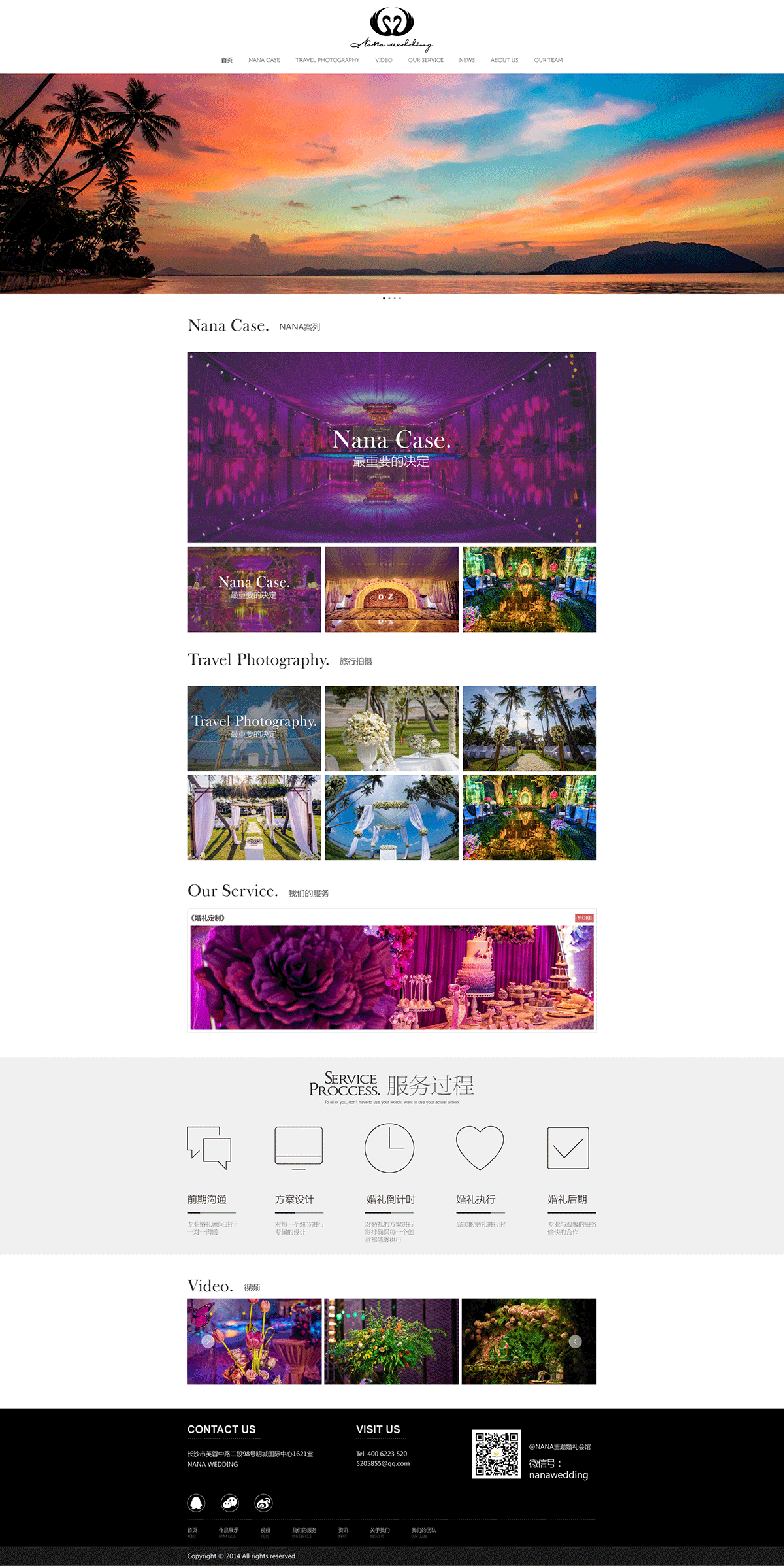 三亚NANA主题婚礼会馆成立于2008年8月份; 一直以来,NANA只做定制婚礼,专注于为新人实现婚礼梦想,以策划优雅、精致、高品质、高品味婚礼为宗旨,以办有灵魂值得回味的婚礼为目标; 坚持对婚礼整体观把握,将新人的各种喜爱元素完美的融合,并准确执行的原则。 NANA主题婚礼会馆是一家时尚色彩、高雅氛围及欧式风情于一身的专业婚礼统筹机构,着重于实行婚礼管家制,着眼于策划、设计与现场执行。